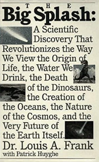 Frank’s small comets, his forty-ton snowballs, are still infalling, ten million or so every year. The circumstantial evidence is still accumulating, trillions of tons of it on the moon and neighboring planets. There are now increasingly sophisticated instruments on spacecraft that can image the small comets and I am confident occasionally they do. These instruments are never used to confirm Frank’s discovery. I suspect most of the scientists operating those instruments have never heard of the small comet flux. The small minority that are aware, studiously avoid following up incidental observations of small comets because they fear contradicting the dominant progressive narrative.1 The University of Iowa, where Frank spent his entire career as a tenured professor has expunged any mention of small comets from his CV and obituary. In the beginning, in 1986, Frank’s colleagues begged him not to publish his papers on small comets. They did what they could to thwart publication. Frank understood their sentiments, if not their actions, were concerned for his, and their reputations. Frank's discovery was extraordinary and beyond startling. Four years later, the words in the subtitle of his book, ‘revolutionizes how we view the origin of… (more or less everything)’ appeared on the cover of the 1990 addition of his book, The Big Splash. The second addition, Cosmic Rain is greatly expanded and was published posthumously in October 2021.